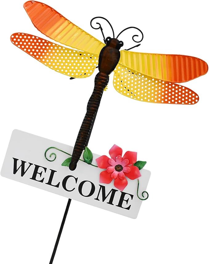 - EASY INSTALL: Decorative garden stake comes in 3 parts, which are pretty easy to assemble. Just screw the dragonfly and stem together by hand,then insert the welcome sign, no tools needed. Dragonfly metal yard art stake will bring more refreshing feel of nature for your pathway,walkway, planter etc.